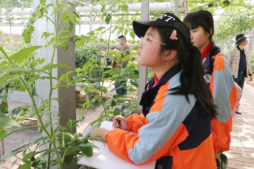 上午,三校师生分别乘车来到神农庄园集合,随后统一组织前往立春蔬果现代栽培展示厅参观。树上结出的西红柿、无土栽培的西红柿;头顶上吊着的鼠尾南瓜、各种奇形怪状的南瓜,特别是园里的太空南瓜,据园艺师介绍可以长到两三百斤。真是闻所未闻、见所未见!同学们个个目瞪口呆、惊叹不已!园内无土栽培、墙体栽培、立体式栽培、栅栏式栽培等技术展示了现代农业技术的发达,能有效地利用空间,节约土地资源。同学们还跟随园艺师来到花卉区,大丽花、海棠花、迷迭香、含羞草、风铃花、满天星……这里的花草品种繁多、应有尽有。